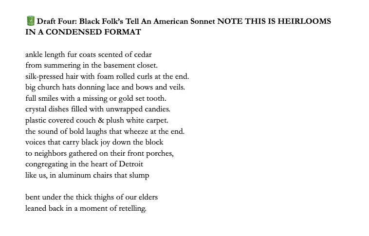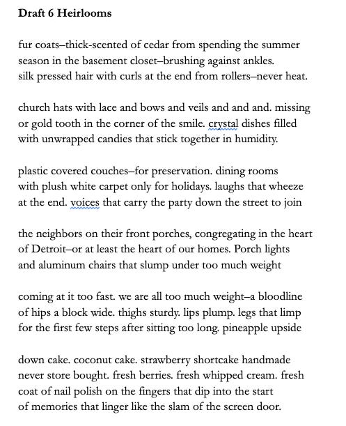 I want to note that an alternate title for this poem had been Home Congregation during the 2nd draft but it didn’t quite feel right. Heirlooms did. Ultimately this poem is about what’s carried forward. What’s inherited, not always intentionally. What lingers in the body, even after the people are gone.