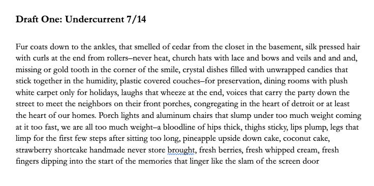 Let’s take a look at a poem that was recently published! This poem started out as a sensory memory dump. I was recalling the way things smelled and felt—the cedar, the way my hair felt tight in the curlers, the old chairs on the porch that bent at an angle. That’s how I entered this poem. All the textures and weight of memories: fur coats, sticky thighs, porch lights, coconut cake, a slam of the screen door.
