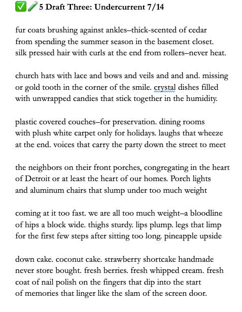 By Draft Six, I was finding a bit more clarity. The big pieces were there, but I started listening closer to the shape of the thing. Letting the poem show me how it wanted to move. Lines got shorter. Some images stood alone that used to be buried. That fresh coat of nail polish detail showed up somewhere in here—it felt small and huge all at once.